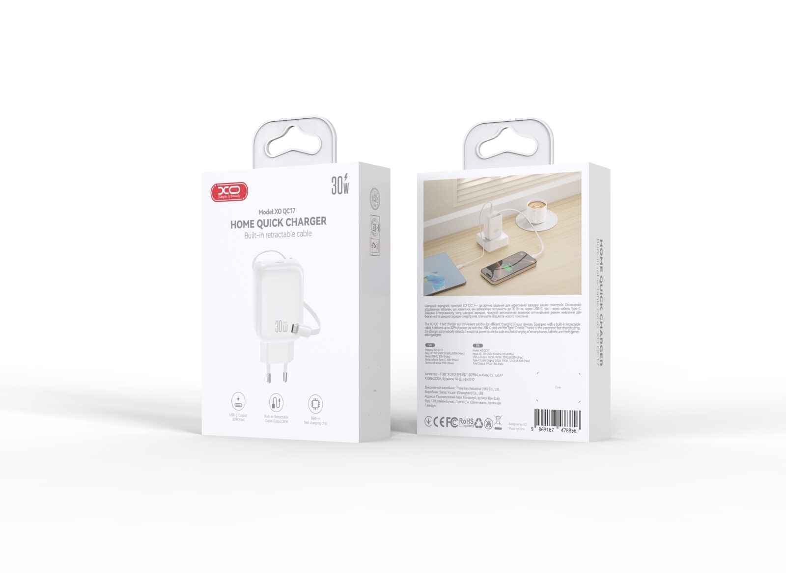 XO QC17 — компактний та потужний GaN-зарядний пристрій із загальною потужністю 30 Вт, з роз’ємом USB-C та вбудованим висувним кабелем Type-C.